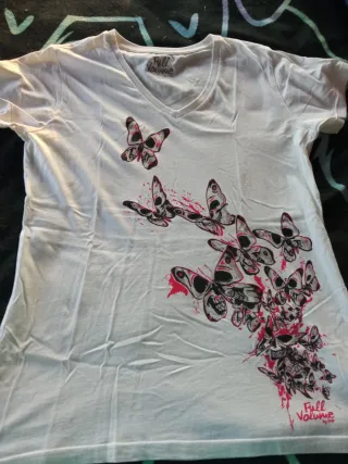 Camiseta de manga corta con un diseño llamativo de mariposas con detalles de calavera. - Estampado frontal de mariposas - Cuello en V.