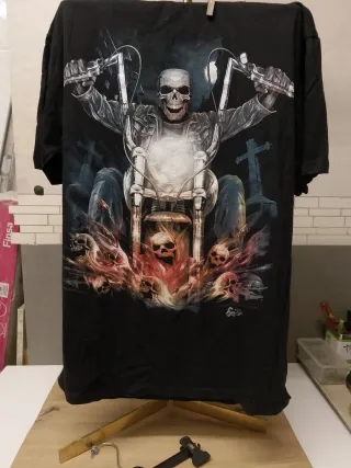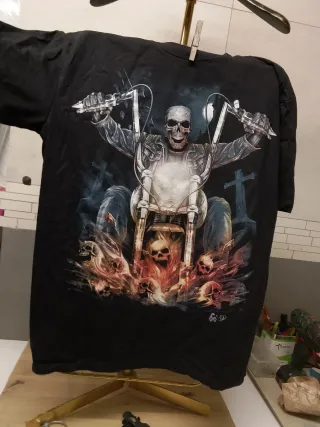 Camiseta negra con un llamativo estampado Frontal y Trasera, con el mismo dibujo. - Diseño de motero con calavera. - Ilustración detallada y colorida. - Estilo rockero y alternativo.