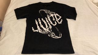Camiseta de manga corta con un llamativo diseño gráfico en la parte delantera. - Estampado de calavera con ojos amarillos y un pájaro. - Texto ( VIOLENCE BE THE VEINS ) en el lateral izquierdo.
