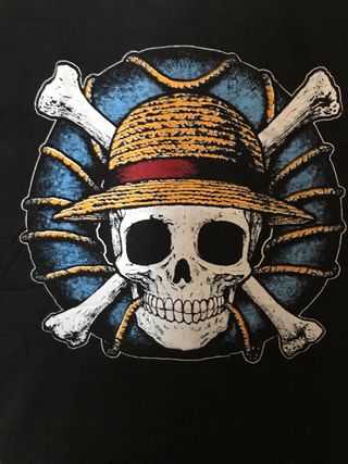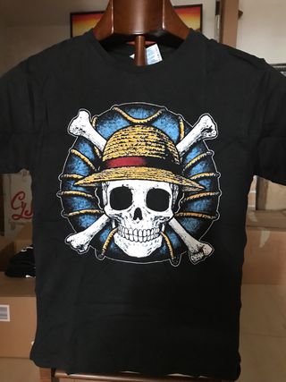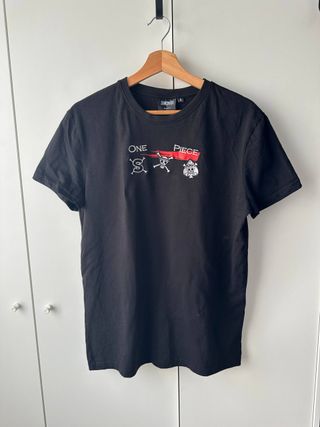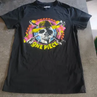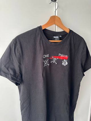 Camiseta negra con el icónico logo de One Piece y la calavera Jolly Roger. - Diseño frontal con ONE PIECE y símbolos. - Estilo casual y moderno. - Tiene algunas marcas blancas como se ve en las imágenes.