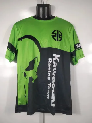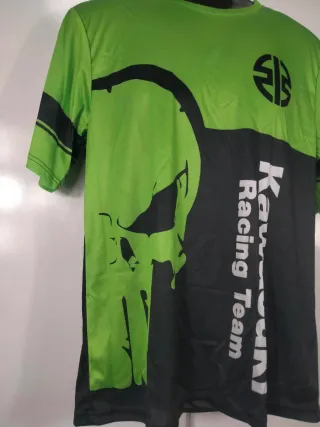 Camiseta ligera de manga corta con diseño deportivo. - Talla XL. Nueva. - Estampado frontal con logo y calavera. - Inscripción Kawasaki Racing Team en blanco. - Mangas con detalles de rayas negras.