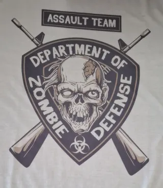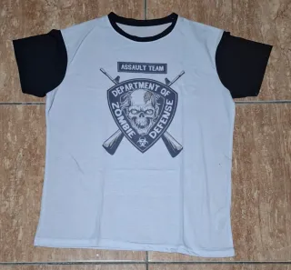 Camiseta con diseño gráfico de Assault Team y Department of Zombie Defense. - Mangas cortas de color negro. - Cuerpo de la camiseta en color blanco. - Estampado frontal con calavera y temática zombie. - poliester tacto algodon.
