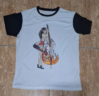 Camiseta con un diseño llamativo de estilo Rock & Roll. - Mangas y cuello en contraste. - Ilustración de chica pin-up con contrabajo en llamas y calavera.