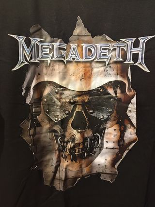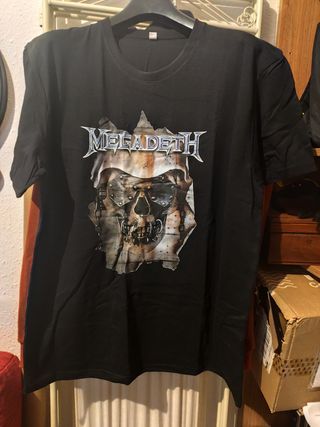 Camiseta negra con diseño gráfico de Megadeth. - Talla 4XL. - Estampado frontal con calavera y logo de la banda. Camiseta de Sintético con impresión en Vinilo de Megadeth 4XL mide Hombros 52 Contorno de pecho 118 Largo 74