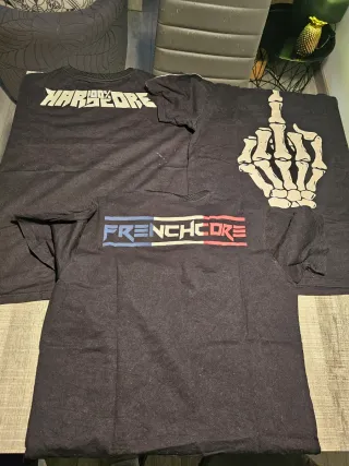 Lote de tres camisetas con diseños llamativos. - Camiseta con diseño de perro 100% Hardcore. - Camiseta con texto UPTEMPO. - Camiseta con diseño de calavera multicolor.