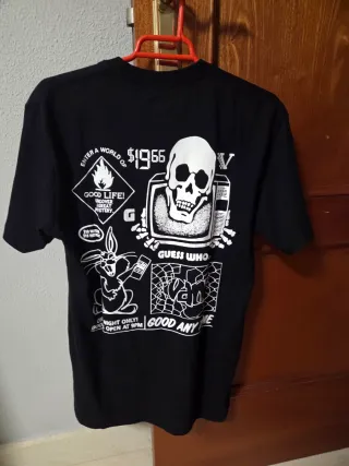 Camiseta de manga corta con un diseño gráfico llamativo en la espalda. - Estampado Enter a world of good life! - Ilustración de calavera y televisión. - Personaje de Bugs Bunny con mando. - Detalle de Guess Who y Good Anytime. Nueva con etiqueta!