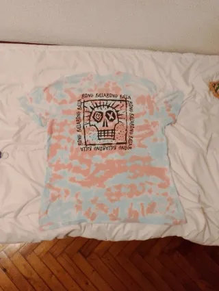 Camiseta de estilo vintage con un llamativo diseño tye-dye en tonos azules y rosas. Presenta un gráfico de calavera en la parte delantera. - Diseño tye-dye único. - Gráfico de calavera con detalles. - Estilo retro.
