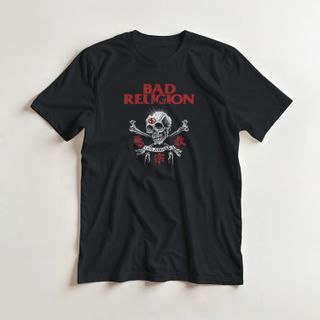 Camiseta negra con estampado de calavera y rosas, estilo rock. - Diseño llamativo. - Manga corta. - Cuello redondo.