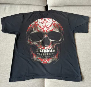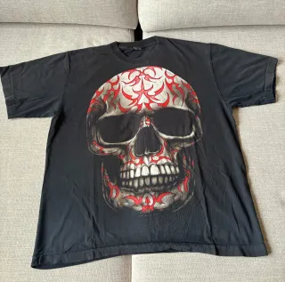 Diseño disponible en todas las tallas de Camisetas. Si estas interesado indica en el chat que talla quieres y te haré un anuncio personalizado para ti. Ten en cuenta que el tiempo de envio es de 15 dias aproximadamente. ESTAMPADO DTG (tinta inyectada), solo frontal. Camiseta de manga corta con estampado gráfico. - Diseño frontal con calavera y texto. - Estampado en color rojo y blanco.