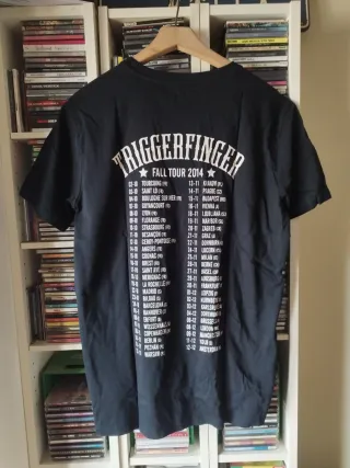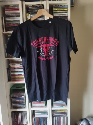 Camiseta negra con diseño frontal de Triggerfinger. - Diseño con calavera de toro y estrellas. - Estampado en color rojo. Talla L. Nueva a estrenar comprada en la gira de 2014. Vendo por qué no me vale.