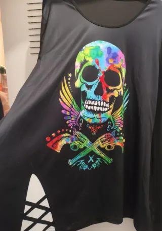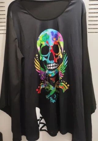 Camiseta negra con un llamativo estampado de calavera multicolor. La 1 XL equivale a la talla 44 - Diseño frontal con calavera - Mangas acampanadas(De ada)