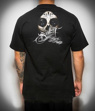 Camiseta negra con un diseño gráfico llamativo de calavera y máquina de tatuar. Precio original 25 € talla americana hacer caso a las medidas de la tabla SMALL A-70 cm B-44,5 cm C-44 cm D-46 cm MEDIUM A-73 cm B-49,5 cm C-50 cm D-50 cm LARGE A-79,5 cm B-52,5 cm C-54 cm D-55 cm XLARGE A-81 cm B-58,5 cm C-58 cm D-59 cm 2XLARGE A-84,5 cm B-63,5 cm C-66 cm D-66 cm 3XLARGE A-88,5 cm B-70,5 cm C-69 cm D-72 cm - Diseño de Nikko Hurtado. - Estampado frontal detallado. - Manga corta.