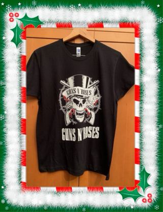 Camiseta negra con el icónico logo de Guns N' Roses. Ideal para regalar en estas Fiestas. “Amigo invisible “ - Diseño frontal con calavera y sombrero. - Estampado del nombre de la banda. - 100% algodón