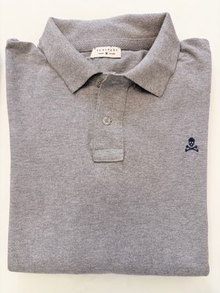 Polo clásico de la marca Scalpers en color beige. Talla M (medidas incluidas en las fotos) Cierre de dos botones marrones oscuros. Pequeño bordado de calavera en el pecho. Composición: 100% Algodón.