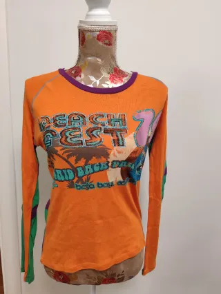 Camiseta de manga larga marca Custo Barcelona, talla 2, con un diseño tie-dye vibrante y detalles de costura en rojo, estampado tie-dye en tonos azules, rosas y verdes. Está en buen estado excepto por 2 ó 3 agujeritos pequeñitos que se ven en la tercera foto.