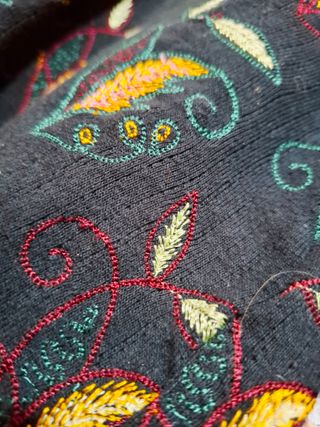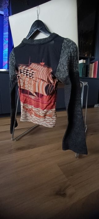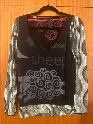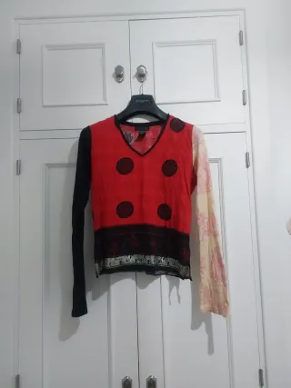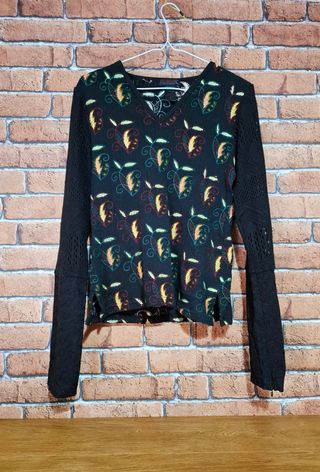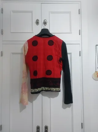 Top original de Custo Barcelona, una prenda con muchísimo carácter y diseño, ideal si buscas algo diferente y de calidad. ✔️ Estado: nuevo,sin etiquetas ✔️ Talla:L(40) ✔️ Color: negro con bordado multicolor ✔️ Escote: en V ✔️ Mangas: largas, con combinación de tejido de punto calado y puño en jacquard ✔️ Detalle especial: cremallera vertical lateral en el puño para ajustar el ancho de la manga (efecto más ajustado o más acampanado) ✔️ Tejidos: mezcla de algodón y poliéster (ver etiqueta en fotos) El bordado y los acabados son de gran calidad, muy característicos de la marca.Se aceptan ofertas razonables.