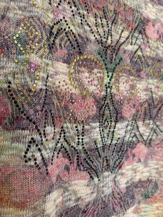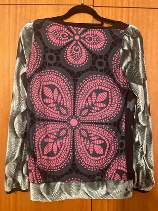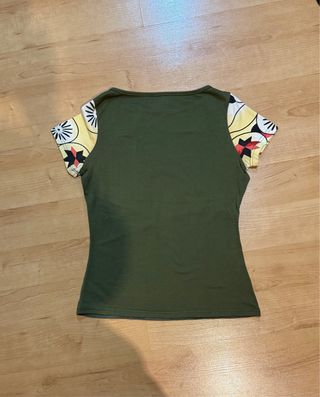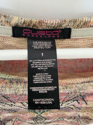 Camiseta de diseño de Custo Barcelona en dos tejidos diferentes. Talla S. Cierre en espalda con botones circulares alternos. Pequeño bolsillo invisible en frontal. Manga francesa. Falta un botón en las manga y otro.en la espalda, pero hay uno en la etiqueta ( por eso el bajo precio). Muy buen estado. - Manga francesa Corte recto - Detalle de banda en el pecho. - Estampado floral con detalles brillantes.