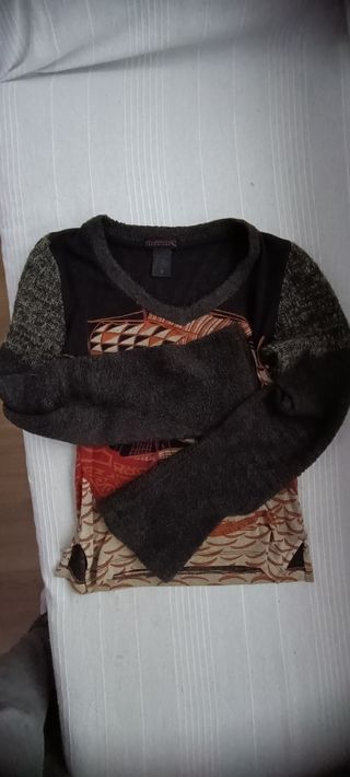 Camiseta Custo con varios tejidos y estampado. - Mangas largas. - Cuello en V. - Combinación de texturas y colores.