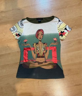 Camiseta con un diseño artístico y colorido. - Mangas con estampado geométrico. - Ilustración central de una mujer en posición de loto. - Detalles en tela brillante en la zona del torso.