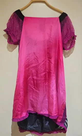 Blusón de la marca Custo Barcelona con un diseño boho muy llamativo. - Mangas de encaje en color fucsia. - Estampado frontal con rostro de león y detalles gráficos. - Panel trasero y laterales en satén rosa brillante. - Cinturón opcional, que también se puede poner en el cuello o cabeza. - Composición: 95% seda, 5% nylon.