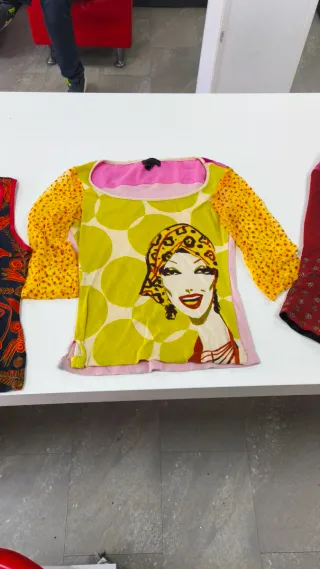 Tres Camisetas de Custo Barcelona con un diseño vibrante y original. Presenta una combinación de estampados llamativos y mangas de diferente textura. - Mangas largas con detalles. - Cuello redondo. - Tejido ligero y cómodo.