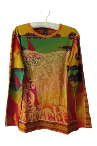 Camiseta de manga larga con un llamativo estampado. - Diseño con motivos florales y geométricos. - Combinación de colores vibrantes.