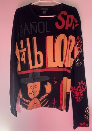 Camiseta de manga larga con un diseño gráfico llamativo. - Estampado frontal con texto y figura. - Cuello redondo. - Puños ajustados. - Las medidas estàn en las fotos.