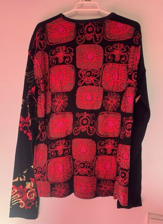 Camiseta de manga larga con un diseño vibrante y llamativo. - Estampado floral en tonos rojos sobre fondo negro. - Mangas con diferentes patrones geométricos y florales. - Cuello redondo.