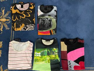 Conjunto de cinco camisetas de la marca Custo Barcelona con diseños vibrantes. - Camiseta con estampado floral y detalles texturizados. - Camiseta con diseño gráfico abstracto y colores vivos. - Camiseta a rayas finas en tonos pastel. - Camiseta con paisaje urbano estilizado. - Camiseta con bloques de color y texto 'TANK'. 5 camisetas 100% originales Custo Barcelona; 4 de hombre una de mujer; no imitaciones, estupendo estado