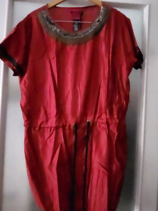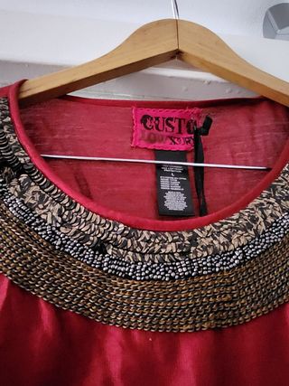 Túnica Custo en granate y negro con lentejuelas en el escote y cordón ajustable. Talla L. Composición 60% viscosa y 40% algodón. Medidas 90 cm largo, 53 cm hombros. Es holgada. Sin estrenar, con etiqueta y recambio lentejuelas