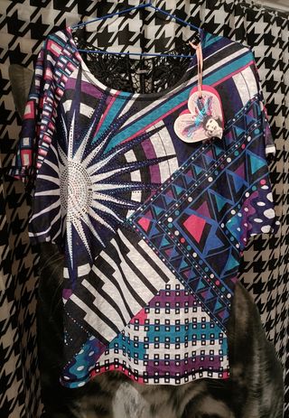 Talla S. Es ajustada al cuerpo. El estampado, geometría y pedrería estilizan la figura, queda muy chula. Con vaqueros o pantalones oscuros. Está perfecta.