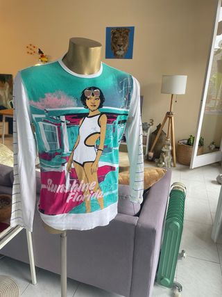 Camiseta de manga larga con un diseño gráfico llamativo en la parte delantera y trasera. - Estampado de una mujer con gafas de sol. - Detalles de zigzag en los hombros. - Tejido ligero y traslúcido con un 60% algodón. - Talla 2. Según el tallaje de Wallapop es una XXXS, por mis tallas en otras prendas es una S o M según lo ancha o estrecha que se quiera lucir