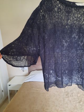 Blusa fina de color azul oscuro con mangas anchas que transparenta y en los dibujos contiene piedritas. En el cuello tiene unas cuerdas para poder atarlo. Tambien incluye una camiseta lisa de tirantes del mismo color. No se han usado y conserva la etiqueta.