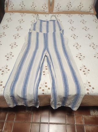 Peto de lino a rayas verticales en tonos azules y blanco roto . Es una prenda cómoda y con un diseño veraniego. Con bolsillos. Se puede poner con o sin camiseta debajo. Sólo envío por correos . - Diseño de rayas. - Tirantes anchos. - Piernas anchas.