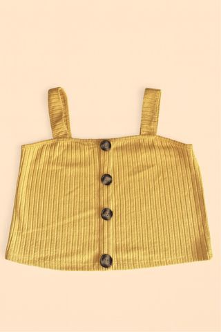 Top de Primark con un diseño de canalé y botones en la parte delantera. Las tiras son anchas y el tejido es elástico. - Diseño de canalé vertical. - Cierre de botones. - Tirantes anchos. - Color mostaza. - En la segunda foto se muestra el color en una foto con flash ya que en fotos se ve distinto según la luz. Solamente envíos.