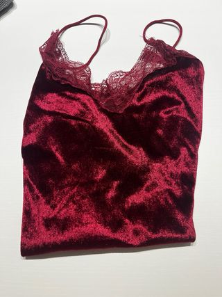 Elegante top de terciopelo con detalles de encaje. - Tirantes finos. - Escote en V con borde de encaje. - Tejido suave y confortable.