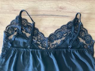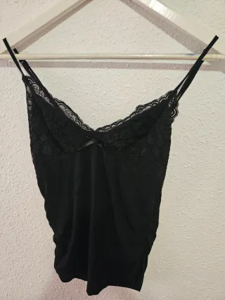 Elegante top negro con detalles de encaje. - Tirantes finos. - Escote en V con borde de encaje. - Tejido satinado. Talla única hasta 48