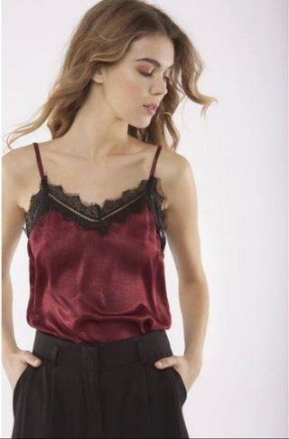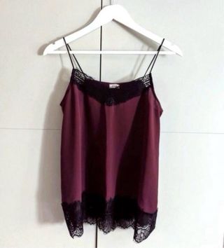 Top de Zara con detalles de encaje. - Tejido satinado. - Tirantes finos. - Ribete de encaje en escote y bajo.