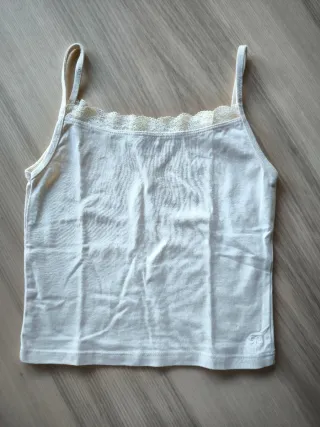 Camiseta de tirantes con un delicado detalle de encaje en el escote. En perfecto estado. - Tirantes finos. - Escote con borde de encaje. - Tejido suave al tacto.