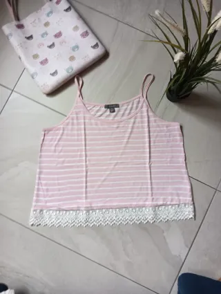 Camiseta de tirantes con un diseño a rayas y detalle de encaje en el bajo. - Estampado de rayas finas. - Adorno de encaje blanco en el dobladillo. - Tirantes finos.Talla desde una 40 a 48