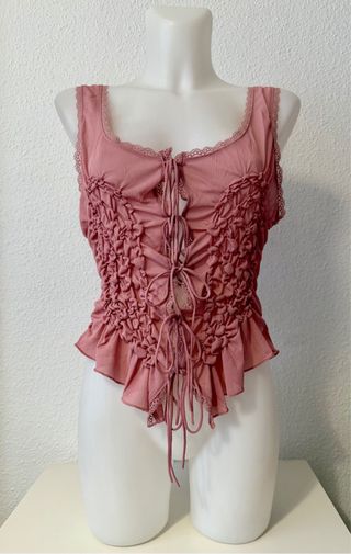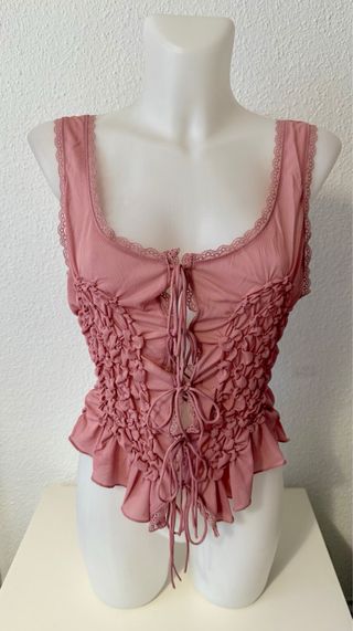 Este top de Zara presenta un diseño fruncido y detalles de corsé. - Escote cuadrado con encaje. - Cierre de cordones en la parte delantera. - Bajo con volantes y encaje. - Tirantes finos.