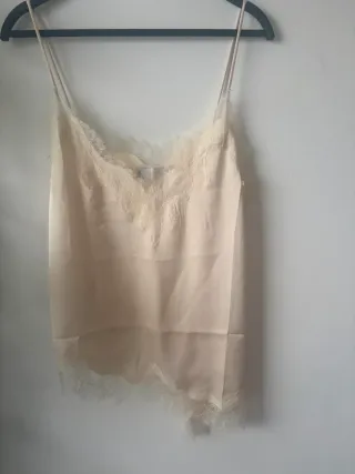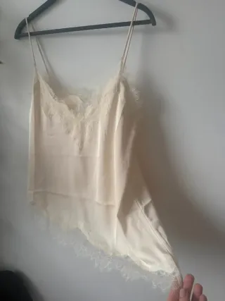Elegante camisa lencera de Zara con detalles de encaje. - Diseño con tirantes finos. - Adornos de encaje en escote y bajo. - Corte asimétrico en el bajo.