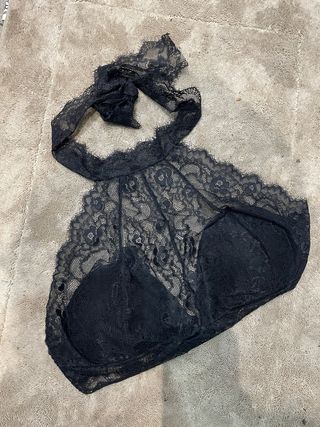 Elegante top lencero de encaje. - Diseño de encaje floral. - Tirantes tipo halter. - Copas con relleno.