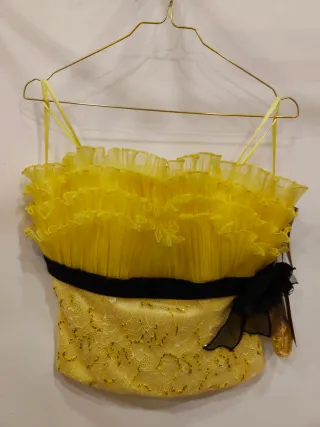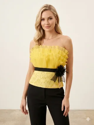 Elegante top sin tirantes en color amarillo, con un diseño fruncido en la parte superior y detalles de pedrería y lazo negro en la cintura. Disponible en tallas 38 y 44. - Diseño fruncido en el escote. - Cinturón negro con detalle de lazo y abalorio. - Tejido con pedrería y encaje.