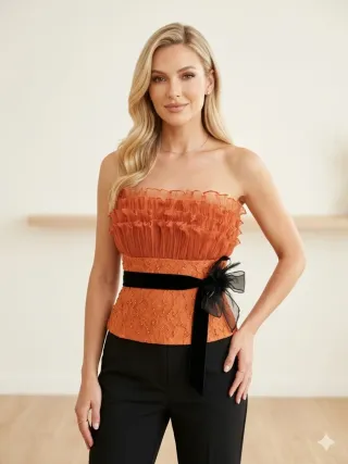 Elegante top sin tirantes en color naranja. Presenta un diseño con volantes en la parte superior y un detalle de encaje con pequeñas perlas en la parte inferior. - Volantes en el escote. - Cinturón negro de terciopelo con lazo. - Encaje con detalles de perlas.