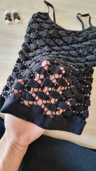 - Top corto de tirantes, encaje negro, con abertura en parte delantera y trasera. - Usado 1 vez. - Talla M, pero da para una talla S también.