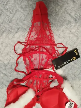 Body lencero de encaje con detalles festivos. - Diseño con ribete de pelo blanco. - Lazos decorativos. - Tirantes ajustables.