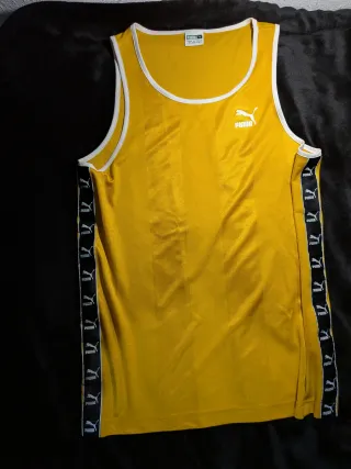 Camiseta tirantes, blanca, para el gym, de la marca Puma. Talla 36/38. Con sujetador integrado. Lleva algún rocecito, se ven en las fotografías, por lo demás en buen estado.