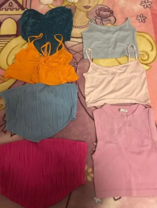 Conjunto de cinco tops de mujer, perfectos para cualquier ocasión. - Top azul con escote halter. - Top naranja con lazada frontal. - Top azul claro de tirantes. - Top rosa palo de tirantes. - Top rosa fucsia sin mangas.