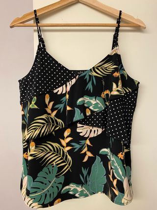 Top de tirantes con un diseño llamativo y original. - Estampado floral tropical combinado con lunares. - Volantes decorativos en la parte delantera. - Tirantes finos ajustables.